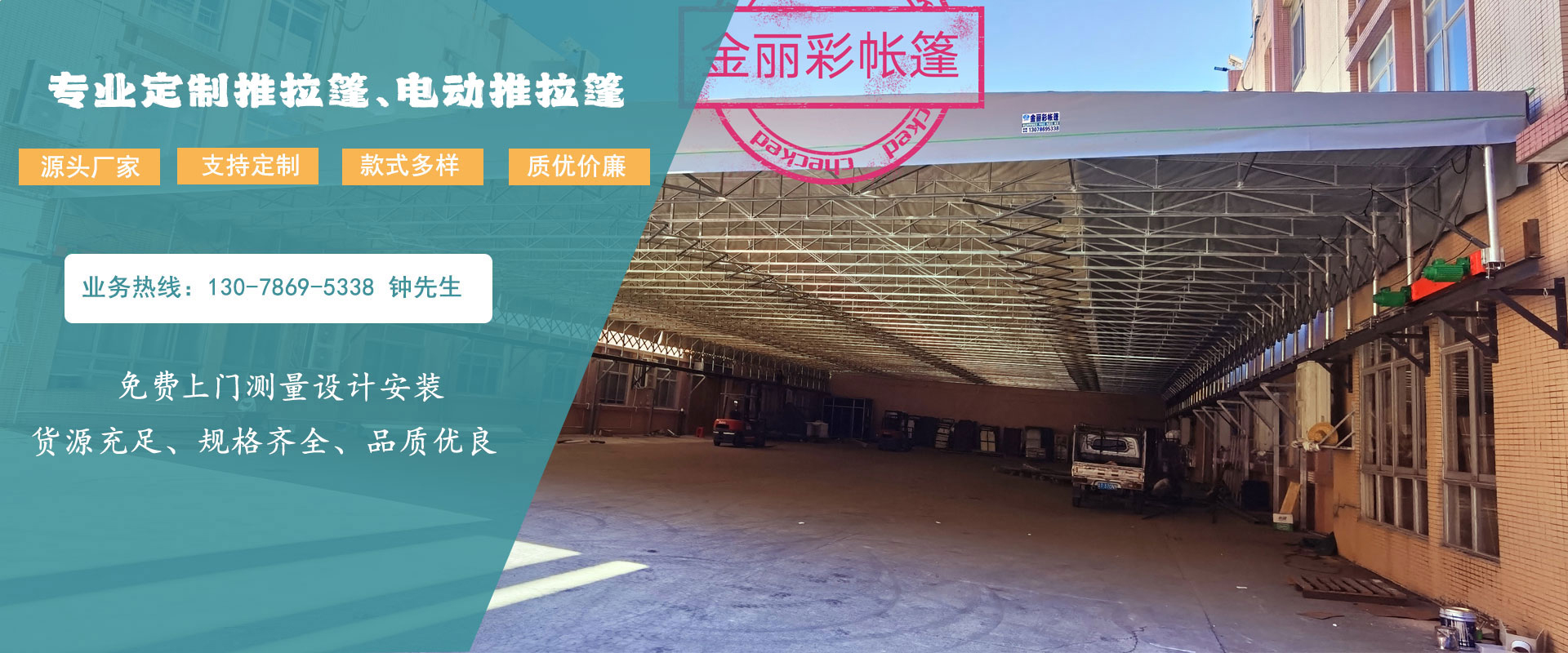 中山市金麗彩帳篷有限公司成立于2002年,是一家集遮陽篷配件生產、批發戶外休閑用品的專業彩蓬安裝制做工程公司,在廣東地區擁有大量彩樣板工程實例,公司技術力量成熟,專注承接定制制作安裝各種遮陽、遮雨、固定或活動蓬、展覽蓬、鋁合金無線遙控電動蓬、廣告蓬、歐式造型蓬、戶外休閑傘等產品。本公司還可以根據用戶需求制作各款大型戶外停車場帳蓬、款式新穎、質量可靠、價格實惠。公司位于中國廣東省中山市沙溪鎮,交通方便,物流快捷。金麗彩帳篷本著“客戶為先,誠信至上”的原則,熱誠歡迎各界朋友前來我司參觀、考察、洽談業務。